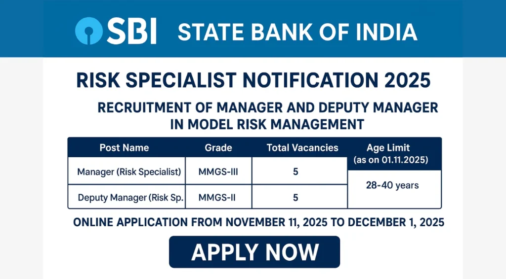 State Bank of India has officially released a notification for the appointment of Specialist Cadre Officers on a regular basis. The bank has announced vacancies for the positions of Manager and Deputy Manager in Model Risk Management. Interested and eligible Indian citizens can apply online from November 11, 2025, to December 1, 2025, through the bank’s official career portal